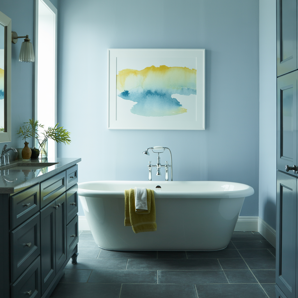 - Hauptwände: Lemon Grass oder Vapor Blue für Helligkeit und Harmonie.